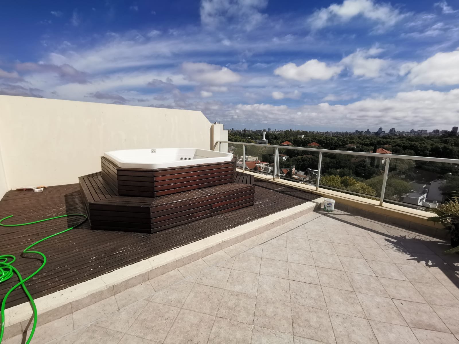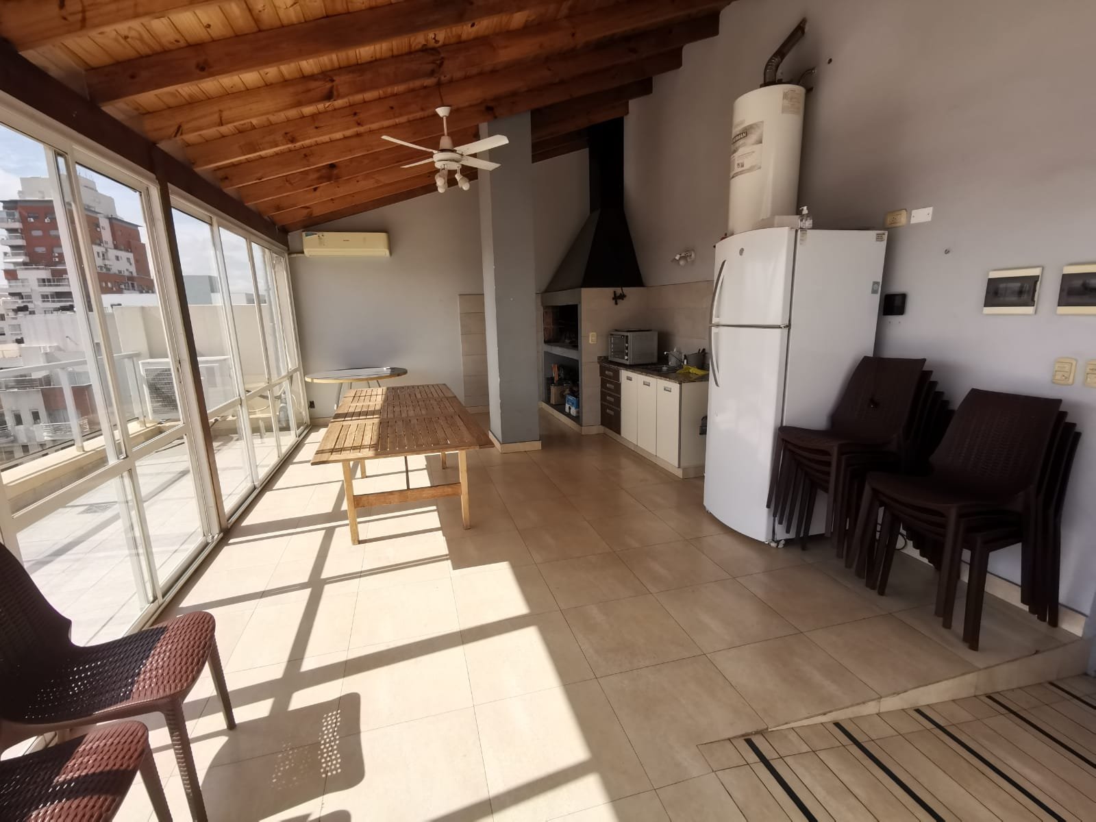 Amenities: SUM con baño y cocina en planta baja, quincho con parrilla en planta alta, terraza con solarium y jacuzzi, sauna y vestuarios.