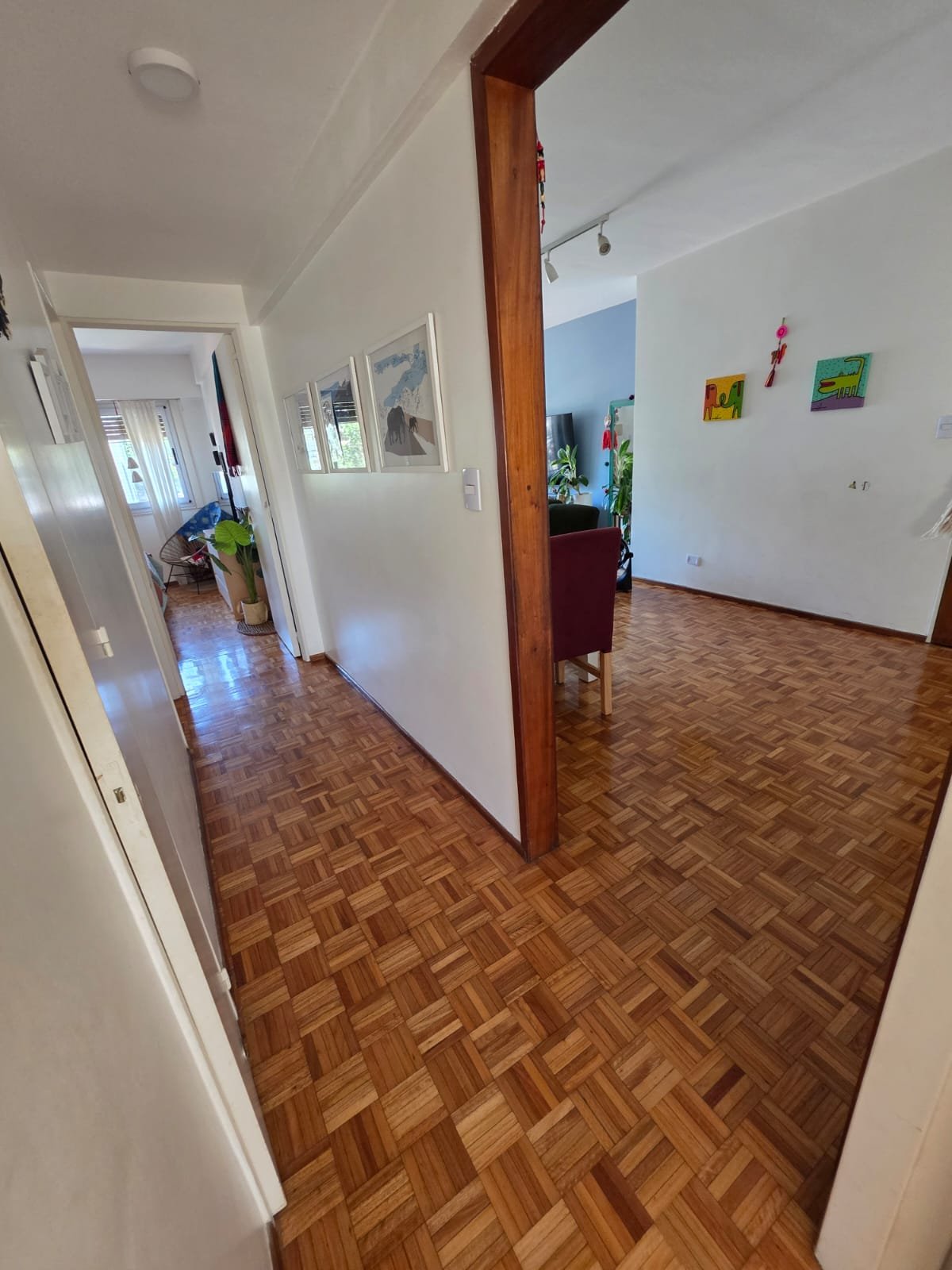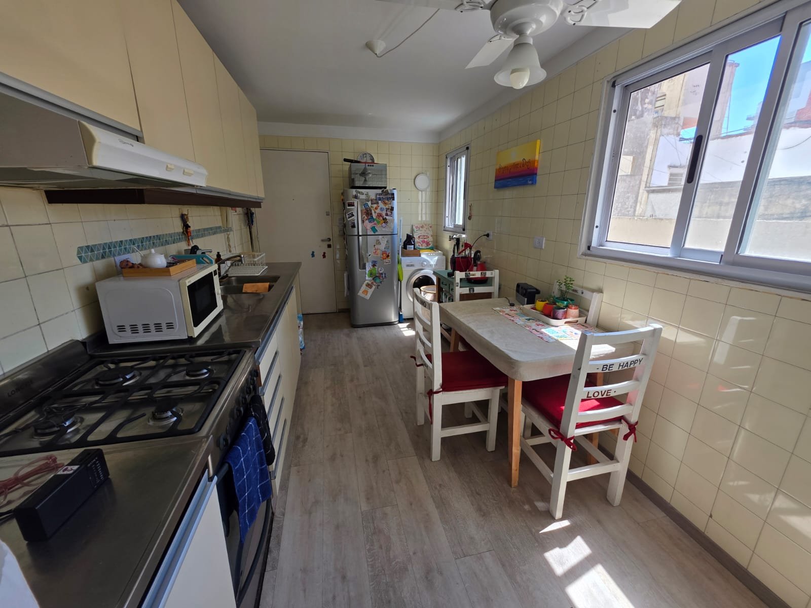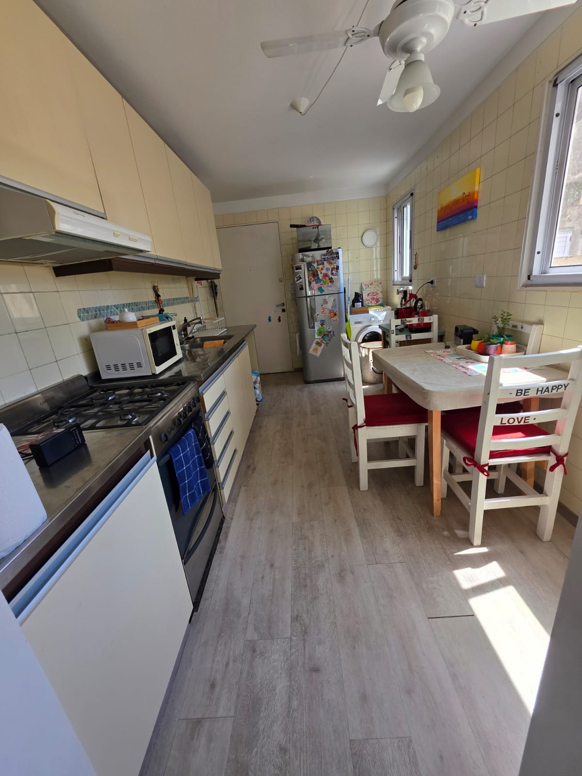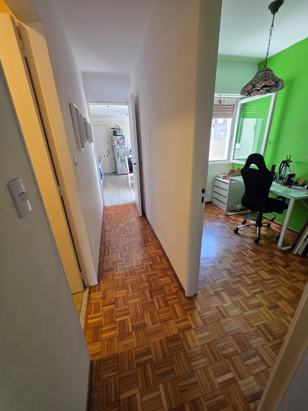Gran living comedor con salida al balcon de 7,8×3,3 ; cocina 4,5×2,6 ; escritorio 2,9×2 ; dormitorio con ventilación al balcon 3,2×2,8 mas placard ; dormitorio al pulmon 3×2,8 mas placard ; baño completo amplio con ventilacion natural y toillet.